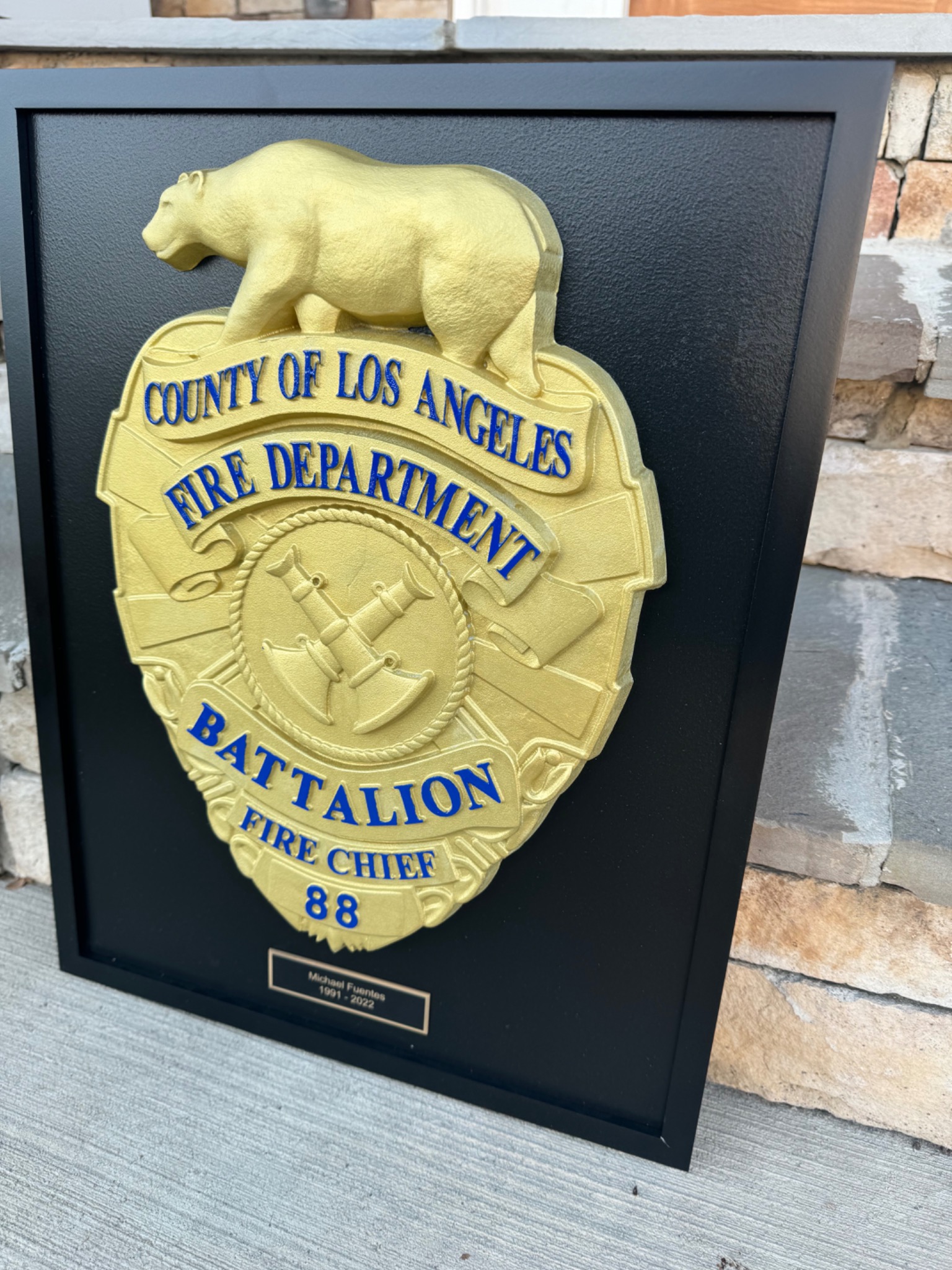 Handcrafted full-color Los Angeles County Fire Department badge available in 12″ and 15″ sizes. Optional frame and engraved plaque add-ons for a personalized display.